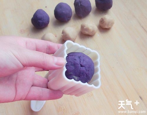 11.月饼模具内刷少许油,将包好的紫薯团放入模具中