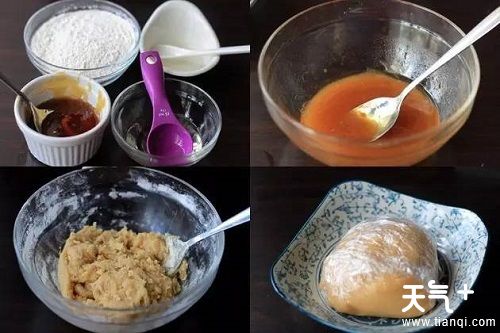 1、将蜂蜜、植物油、碱水混合,加入面粉,进行搅拌,保鲜膜包起面团,冷藏1小时。