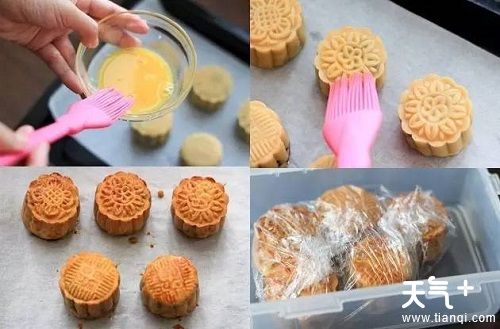 4、压好后,将1个蛋黄与1茶匙蛋白混合,涂抹在月饼表面,再喷一点水。烤箱预热至180度,烤5-8分钟,取出再刷一层薄薄的蛋液,继续烤15分钟,至月饼呈金黄色。