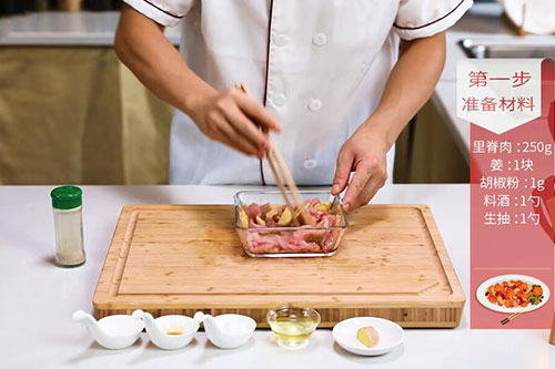 1.姜1块,切姜片,里脊肉切成大小均匀的长条;