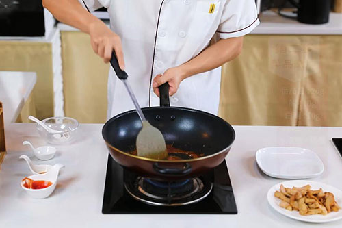 5.锅中放入适量油,油温烧至7成热,放入番茄酱20克、白糖10克、醋10克、盐半勺转小火将白糖炒化后放入适量水淀粉收汁;