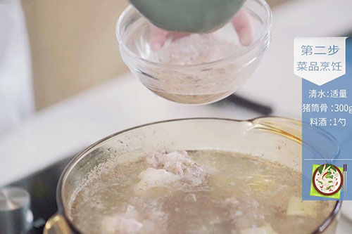 4.锅中放入适量清水,放入姜片、猪筒骨、料酒1勺烧开;