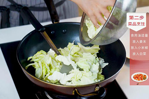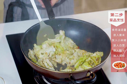 4.放入切好的白菜翻炒半分钟,倒入醋汁转大火快速翻炒至白菜断生,调入盐1勺,鸡精1勺翻炒均匀即可。