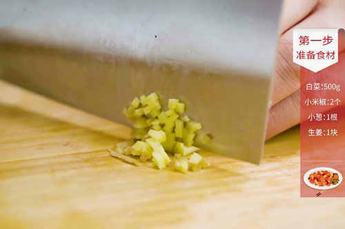 1.白菜洗净撕成小块,小米椒2个切圈 葱1根切葱花,姜1块切姜末;
