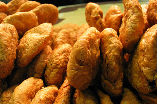 大饼包小饼是士林夜市的五大小吃之一,这款小吃从上世纪80年代开始流行,至今已经成为了士林夜市的代表小吃之一。什么是大饼包小饼呢?就是在大张面皮里面,包上一个小油酥饼,口味分成了咸的和甜的两种,甜的一般是豆沙,枣泥馅,咸的是花生、咖喱等口味,品种多样,非常好吃。