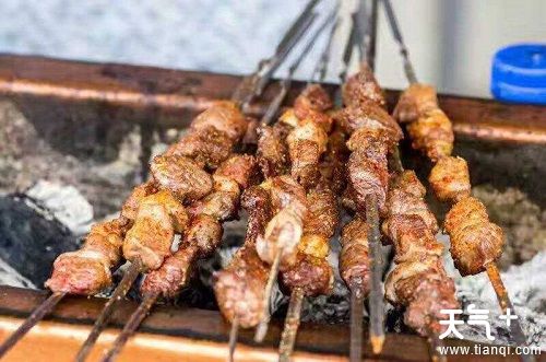 新疆的烤羊肉串现在已经流行到了全国各地,但只有新疆的最为地道。用无烟煤烤,羊肉串的油滴到了炭火上,发出滋滋的声音,风一吹,香味飘到很远的地方。羊肉串又大又香,肥瘦适中,放了辣椒粉、盐、孜然的羊肉片烤熟以后入口即化,那种鲜、香、嫩的感觉实在是妙不可言。正宗的串烤肉也和烤全羊一样色泽焦黄油亮,味道微辣中带着鲜香,不腻不膻,肉嫩可口。一般的烤肉摊上分别有烤羊肉、烤羊心、烤羊腰子、烤塞皮、烤羊肝等等。夏天的夜市上都有卖的,价钱公道,比起专卖店便宜很多。