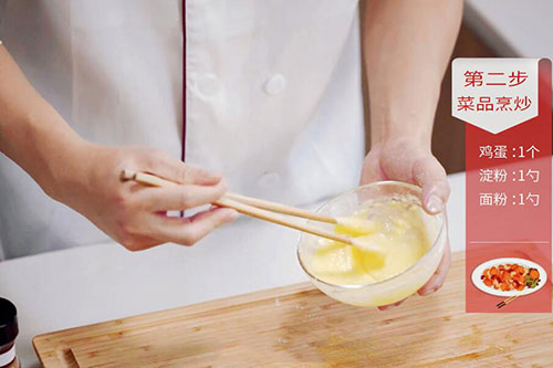 2.将鸡蛋打入碗中,放入1勺淀粉、1勺面粉,搅匀成蛋糊;