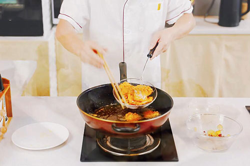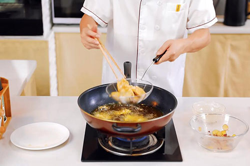 3.锅中放入适量油,油温烧至7成热,将带鱼放入蛋糊中均匀的裹上蛋液后放入锅中炸至金黄后捞出;