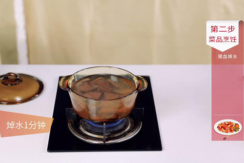 4.锅中倒入适量水,烧开后放入猪血焯水1分钟,捞出待用;