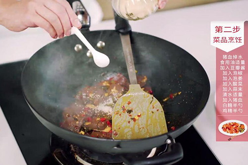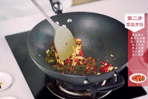 5.锅中放入适量油,油温烧至7成热,放入郫县豆瓣炒出红油,放入泡椒、泡姜、蒜末、酸菜炒出香味;