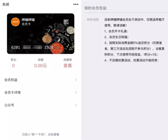 比如火锅连锁品牌呷哺呷哺关注官方微信后,即有消息指引新用户登记信息领取会员卡享受会员特权,激活会员卡后马上发放了优惠券引导到店消费,另外提供线上储值功能,充值不同的金额等级可获得不同价值的礼券。顾客初次消费体验有好感后,自然会再次消费,随着消费次数增多,就会觉得充值比较划算。