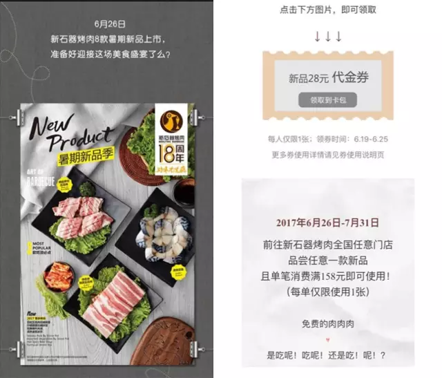例如,新石器烤肉通过长久的菜品消费及口味喜好分析,在暑期推出“厚切五花肉”、“泡菜五花肉”、“挪威青花鱼”等多款暑期新品,并且推出新品试食代金券,微信用户领取后到店消费满158元可以凭近乎免费的价格品尝新品,并且搭配精美图文介绍新品,为新品宣传助力。这样顾客消费时便会忍不住尝试新品,而“免费吃肉”的福利也会吸引客户到店消费。