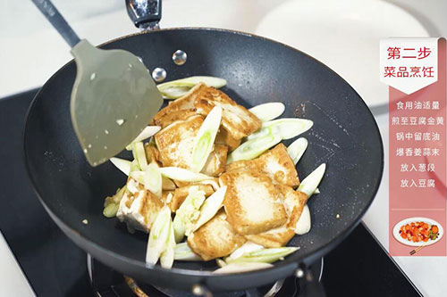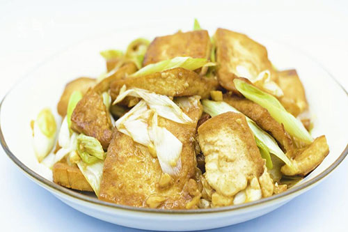 农家葱爆豆腐的做法 豆腐怎么做好吃豆腐洗净切片,大葱斜切段,蒜切末;油锅温烧至7成热,放豆腐小火煎至金黄捞出;留底油,放蒜末爆香,放葱段、豆腐炒匀,放蚝油、盐、鸡精、生抽拌匀后盛出即可。