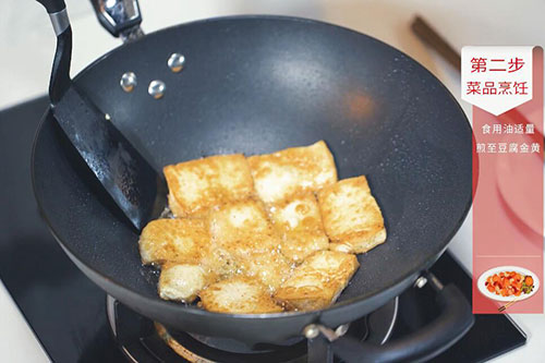 2.锅内放入适量油,油温烧至7成热,放入豆腐小火煎至2面金黄捞出待用;
