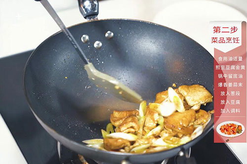 3.锅中留底油,放入蒜末爆香,放入葱段、豆腐炒匀;