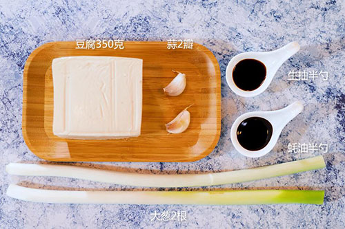 1.豆腐洗净切厚片,大葱2根斜切段,蒜2瓣切末;