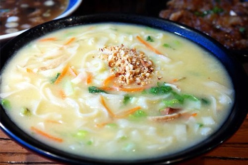 洛阳浆面条相信不少人都知道,这是很有人气的一种洛阳小吃,也是很多人都喜欢吃的地方特色。来到洛阳,很多的餐厅都能吃到这道小吃,浆面条是用豆浆、杂豆面条制作而成,加入了白菜、大绿豆和红萝卜、肉沫等等,配料丰富,口感咸香,味道鲜美,营养健康,是很有地方特色的知名小吃。