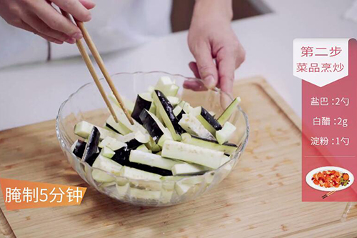 2. 茄子放入盐1勺、白醋2克、淀粉1勺拌匀腌制5分钟;
