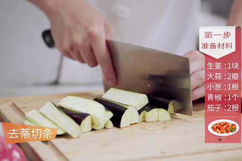 1.茄子洗净去蒂切条 ,青椒去蒂去籽切块;