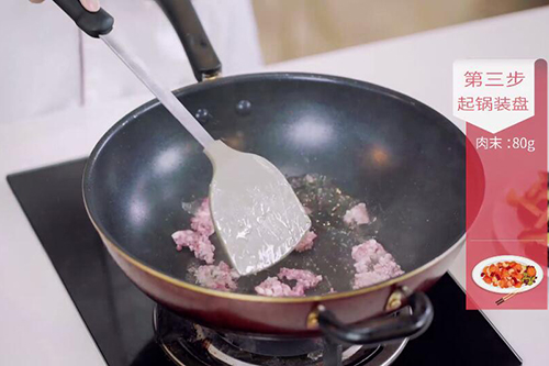 5.锅中放入适量油,油温烧至7成热,放入姜蒜末炒香,放入肉末炒干水分;