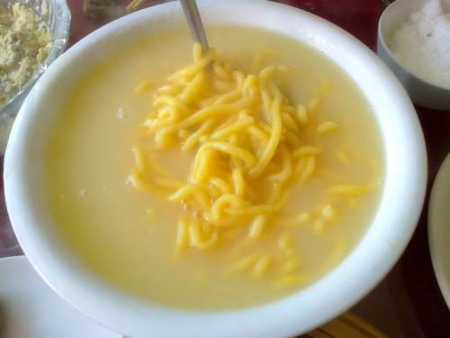 酸汤子是用玉米味原料做成的,面条是黄色,将玉米碎清洗干净之后,让它自然发酵,然后有点酸味的时候将其捞出来,磨成水面,煮熟就可以食用了。酸汤子味香而微酸,顺滑爽口,吃起来很开胃。