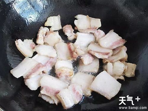 5、锅烧热放入先肥肉多的部分,炸出油来,油熬下来过多可以盛出一部分