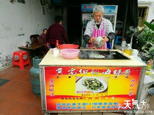 寻找鼓浪屿美食时发现了黄老伯海蛎煎,这是一个位置在内厝澳码头的附近的小摊位,在一条小巷里但是红色的大招牌很是显眼,黄老伯和蔼亲切很爱笑,海蛎煎的价格是一份20元。