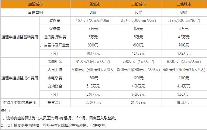 蛙遇牛蛙加盟费在18~25万元左右,其中包括设备费、广告宣传及开业费、店面租金和人力成本费用等等。在餐饮行业来说,这个价格还算适中,感兴趣的朋友可以认真了解一下。
