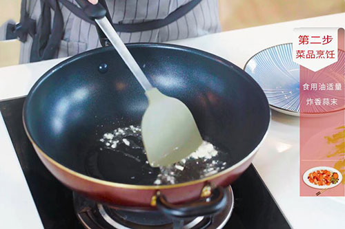 3.锅内放入适量油,低温炸香蒜末,放入茭白丝,青椒丝翻炒;