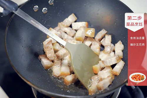 3.锅中放入适量油,油温烧至7成热,放入五花肉小火煸炒至微焦;