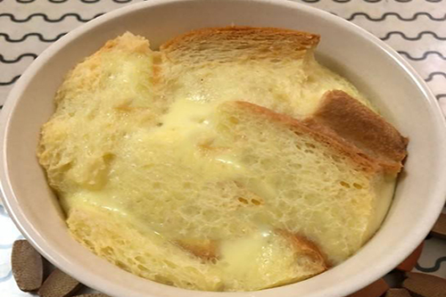 4、把搅拌在一起的鸡蛋牛奶倒入面包里,按一按,让面包吸收布丁汁