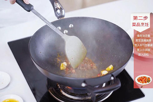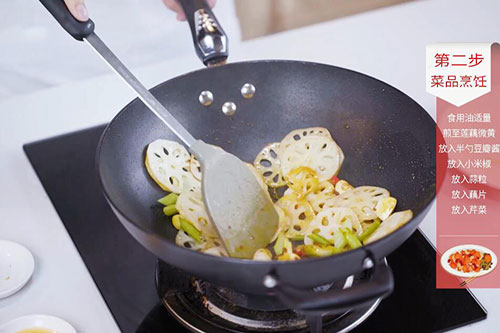 4.放入芹菜炒至断生,放入藕片、小米椒继续翻炒,放入生抽半勺、白糖半勺、鸡精半勺拌匀后即可出锅。