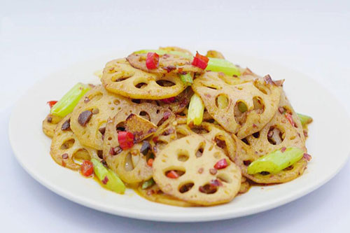 莲藕去皮洗净切片,放清水中待用,芹菜切块,小米椒切圈,蒜切粒;油锅烧至7成热,放莲藕煎至表面微黄盛出;留底油,放豆瓣酱、蒜粒炒出红油,放芹菜炒至断生,放藕片、小米椒继续翻炒,放生抽、白糖、鸡精拌匀出锅即可。
