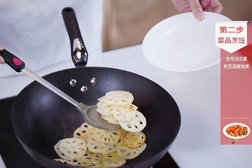2.锅中放入适量油,油温烧至7成热,放入莲藕煎至表面微黄,盛出待用;