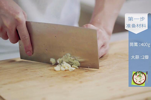 3.锅中放入量油,油温烧至7成热,放入蒜末爆香,然后放入茼蒿杆翻炒至断生;