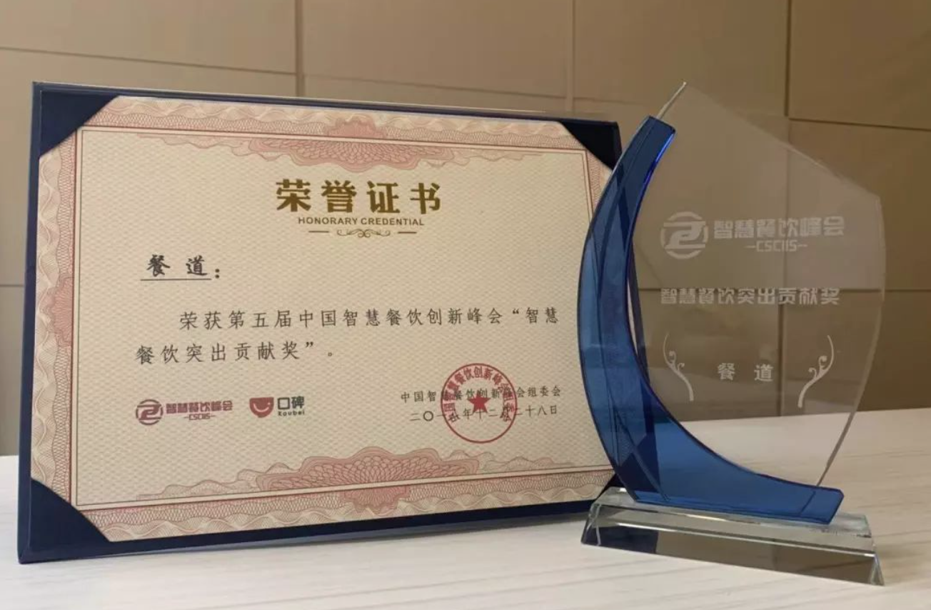凭借在先进技术上为餐饮行业发展提供了满意服务、拥有较高市场占有率、取得行业和市场的认可、受到餐饮企业欢迎等多项过硬指标,餐道荣获由智慧餐饮峰会和口碑协颁发的第五届中国智慧餐饮创新峰会“智慧餐饮突出贡献奖”。