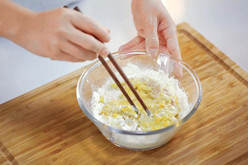 3.碗中放入红薯淀粉100克、面粉40克、鸡蛋1个,加入适量清水拌匀调成较浓稠的糊状;