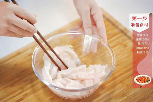 1.姜1块切末,鱼柳洗净,切成粗条;