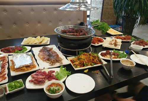 这家店是出了名的好吃而且很划算,调料是自助式的,顾客可以根据自己的口味进行调整,烤茄子,烤大鱿鱼,分量都很足,还有烤猪皮和猪排吃的人都很多,食材多样,也很新鲜,关键的价格便宜,一碗冷面才8元,也是良心价。这家烤肉店在人民街还是人气很高的,本地人和外地游客都会去吃。