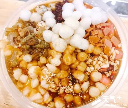 冰粉的其他配料也很实诚,醪糟花生山楂葡萄干芝麻等等,最最惊艳的是手工糍,非常有嚼劲,再裹上一点黄豆粉粉,放在冰粉里面,那滋味简直不摆了。