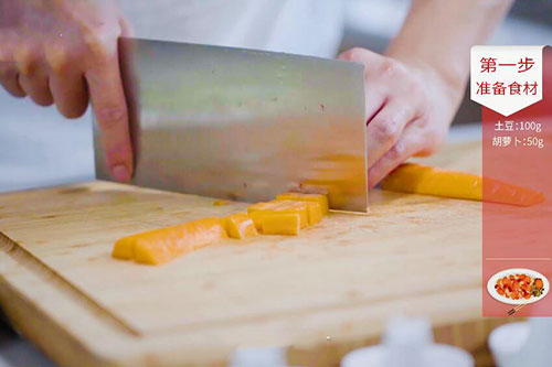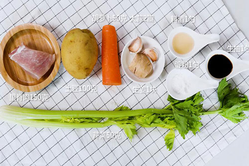 里脊肉150克,土豆100克,胡萝卜50克,芹菜50克;