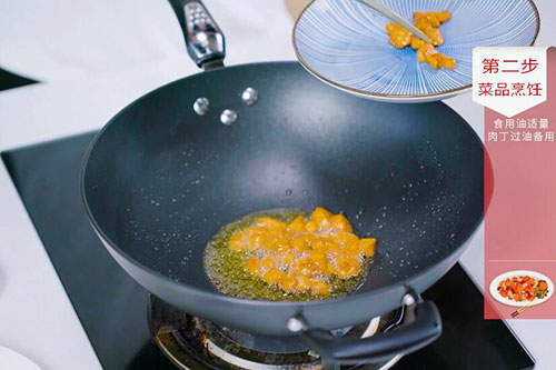 4.锅中放入适量油,油温烧至7成热,放入肉丁快速滑散,变色后盛出备用;