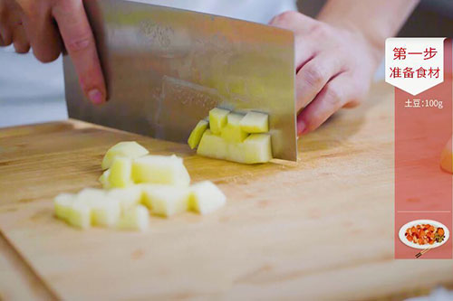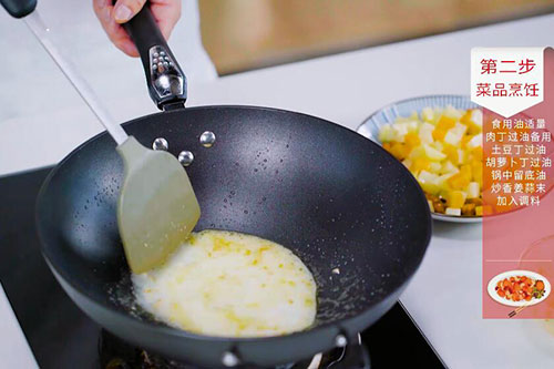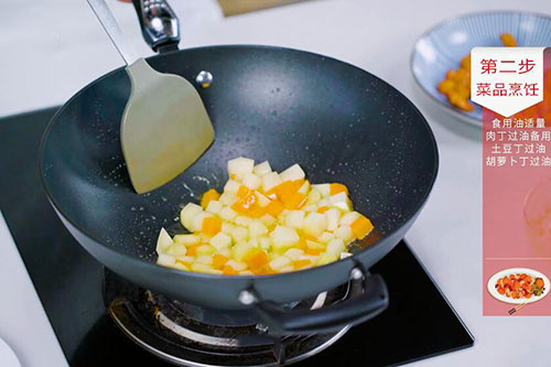 5.放入土豆丁、胡萝卜丁炒至断生,盛出备用;