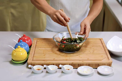 3.放入蒜末、小米椒、生抽1勺、醋1勺、盐半勺、鸡精半勺、白糖5克、香油5克拌匀后撒上香菜即可