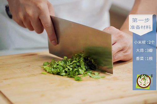 1.小米椒2个切圈,蒜3瓣切末、香菜1根切段;