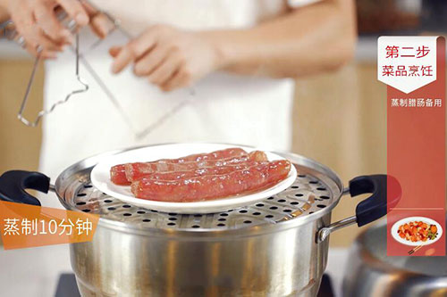 2.锅中放入适量水烧开,放入腊肠蒸制10分钟;