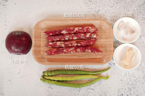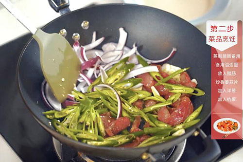 腊肠的做法比较多样,现在要介绍的是小炒腊肠的做法,杭椒切丝,洋葱切条,水烧开放腊肠蒸10分钟,取出放凉切片,油锅烧至7成热,放腊肠炒10秒,放姜蒜片炒香,加洋葱炒至断生,最后加鸡精炒匀即可。