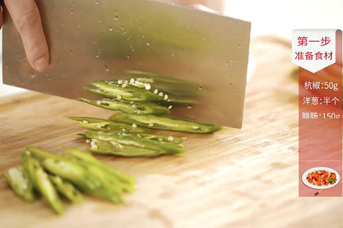 1.杭椒斜切丝,洋葱半个切条,蒜2瓣切片,姜1块切片;