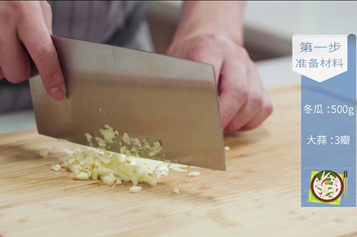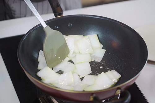 3.锅中放入适量油,油温烧至7成热,放入蒜末炒香,放入冬瓜翻炒至变软;