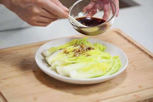 5.锅中放入适量油,油温烧至8成热,关火,将热油淋在娃娃菜上即可。